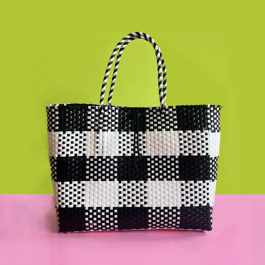 Bicycle Pannier recycled black & white plastic woven basket tote bag