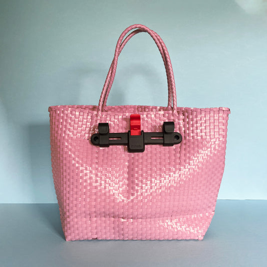 Bicycle Pannier recycled Pink plastic woven basket tote bag with toggle closure