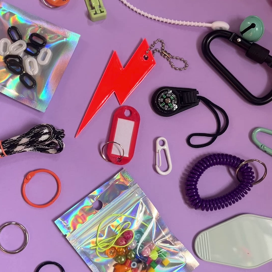 DIY kit to make your very own - one of a kind bag charm, or keyring. Use all together, or separately this pack has everything you need to make something special for you or a friend. Comes with carabiner and multi colour bells, nylon cord, miniature portfolio and various split rings.