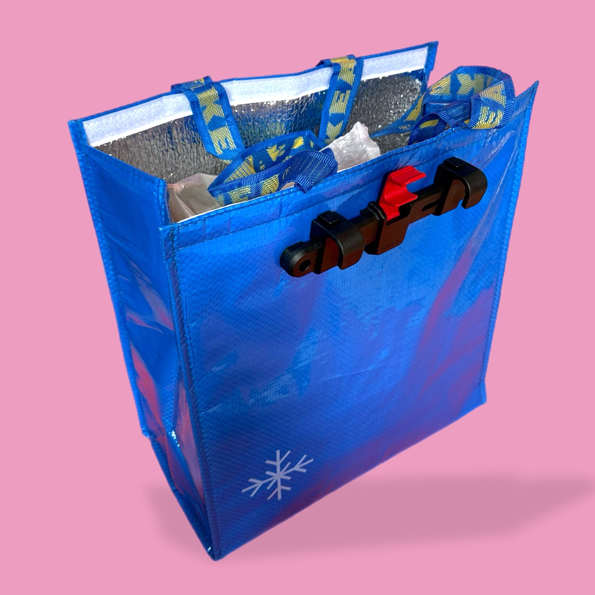 Made from an upcycled Ikea bag, this cool bag features double handles, nylon webbing handles and binding. The cool bag keeps food frozen for approx. 2 hours and is made from 100% recycled materials.