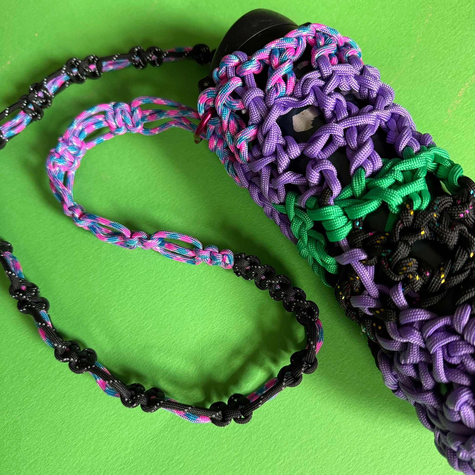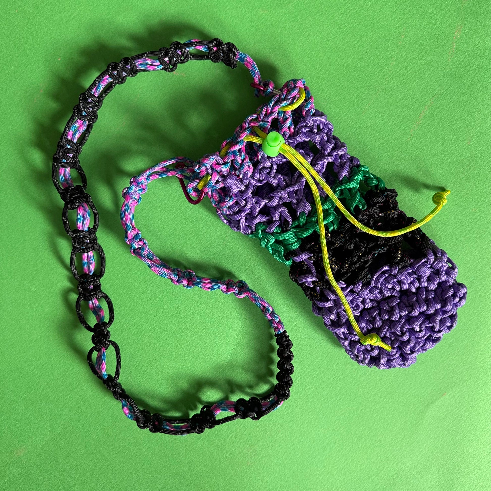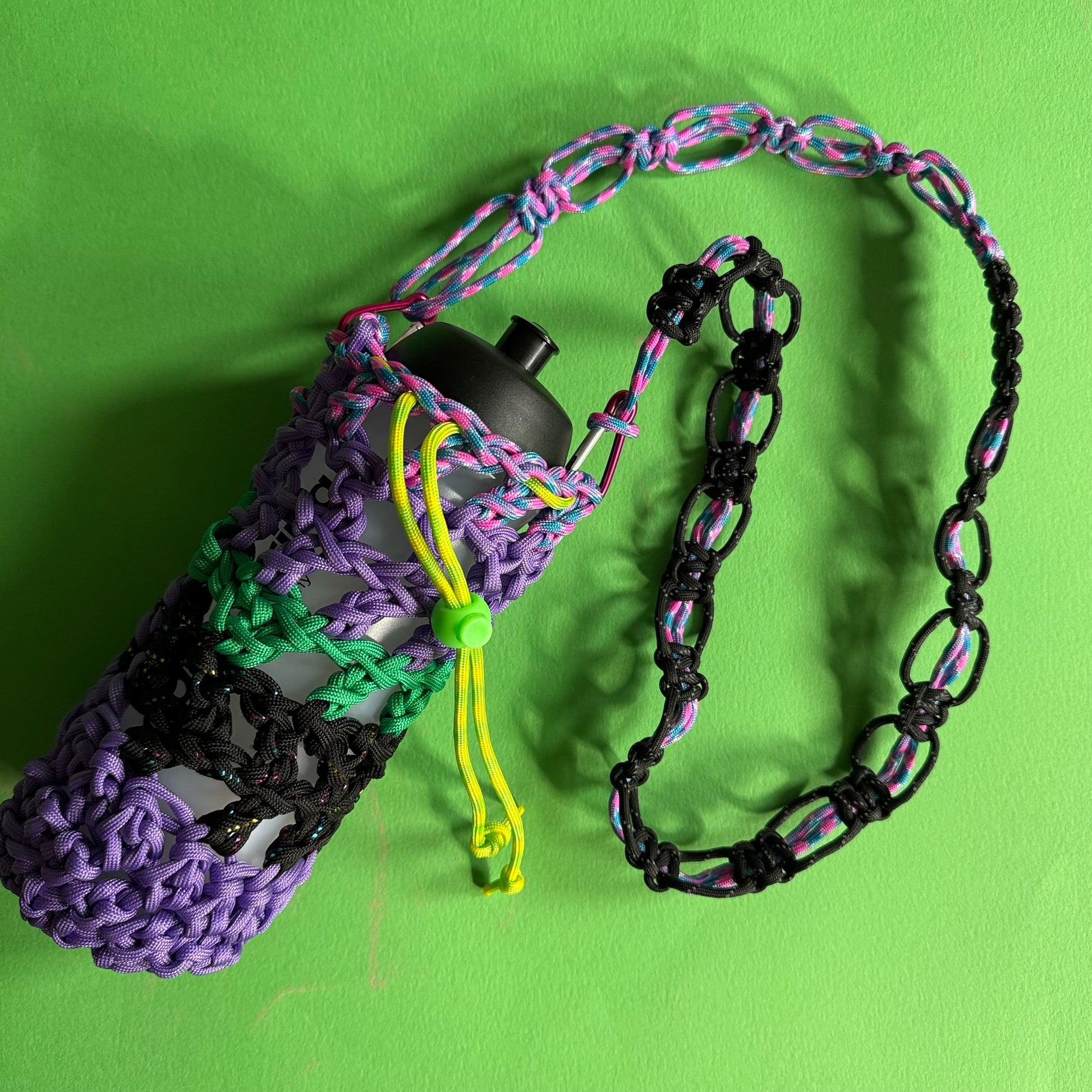 Paracord macrame bottle bag or net bag with tassel detail designed and made in Hackney by Goodordering Jacqui Ma. Neon ombre cord, adjustable in size can fit most water bottles.