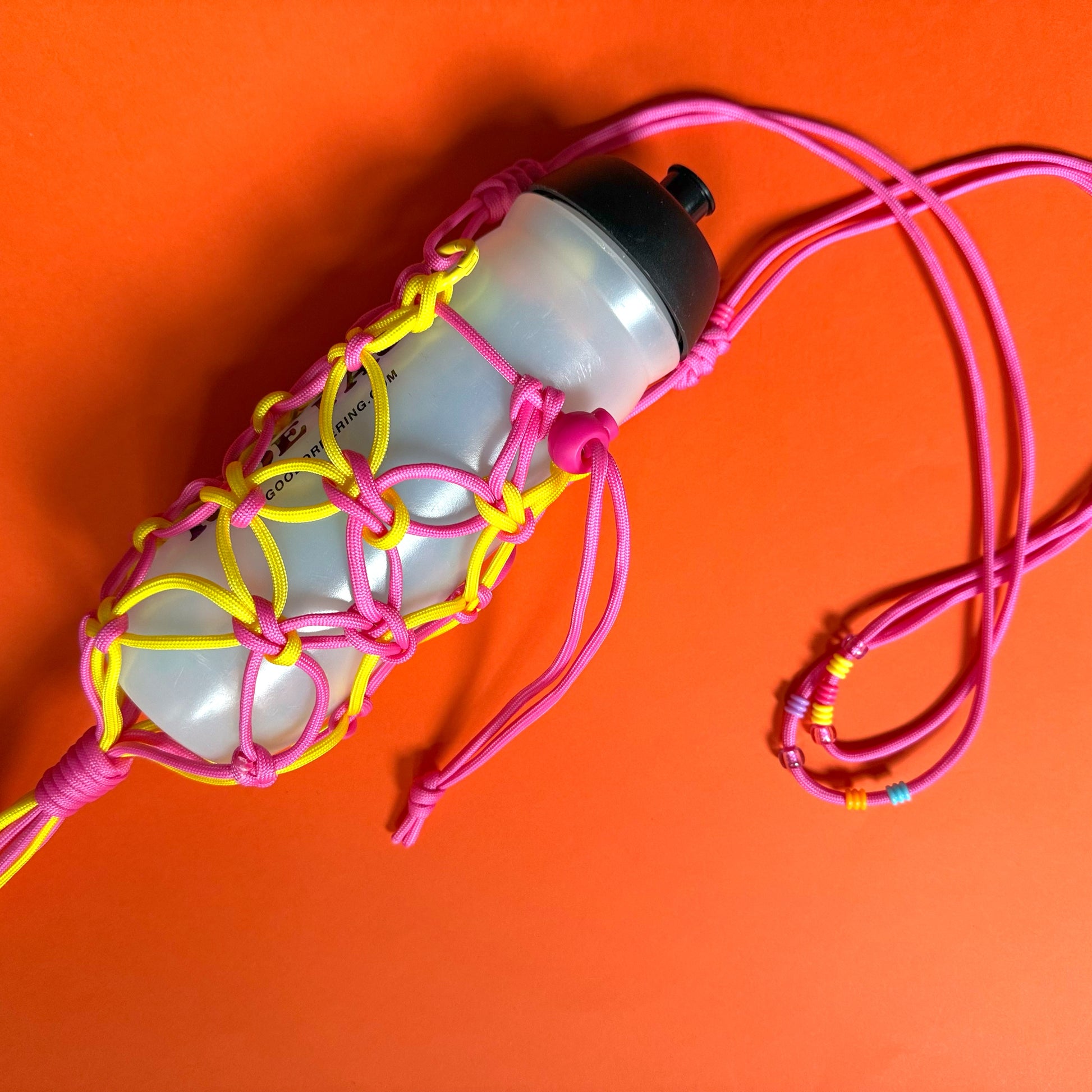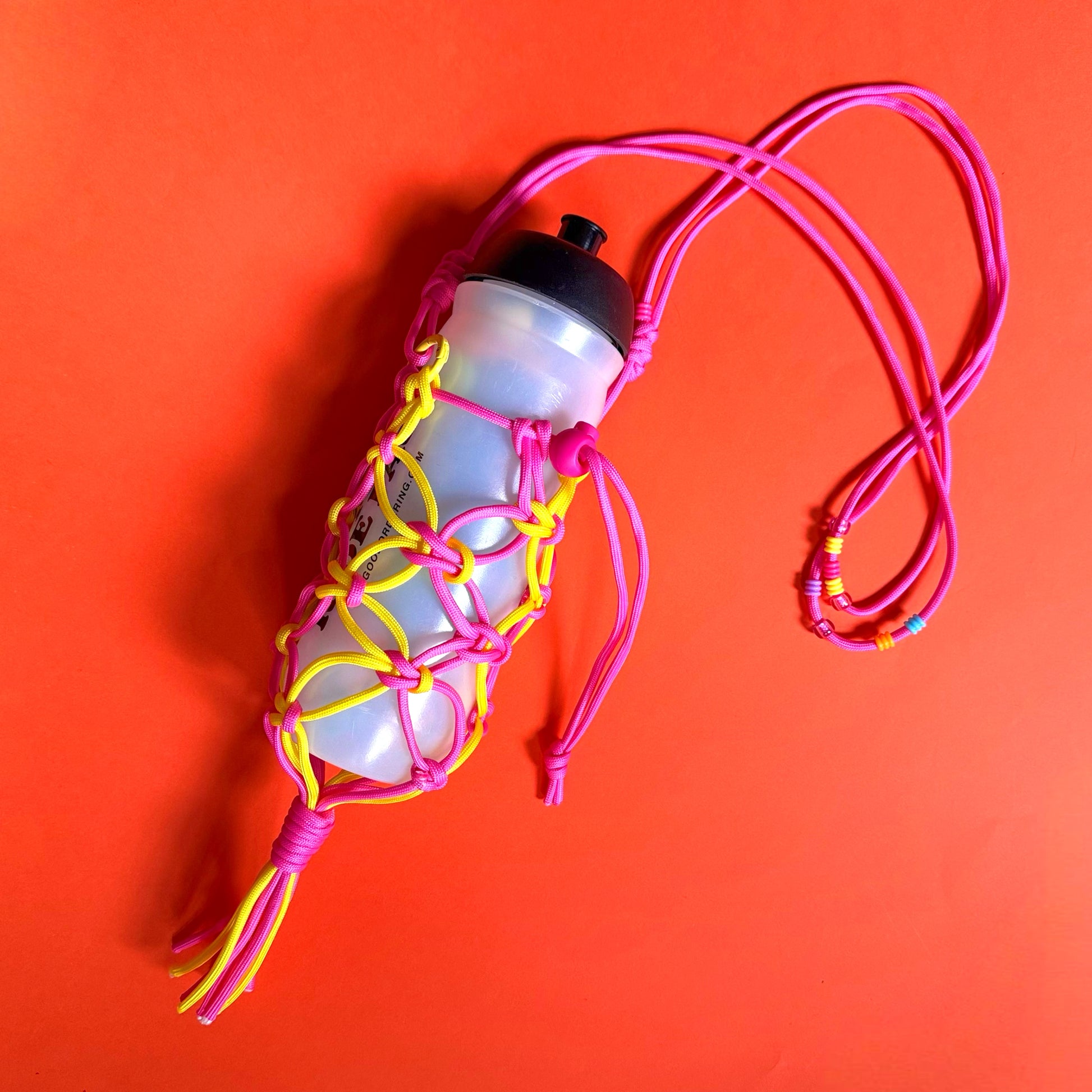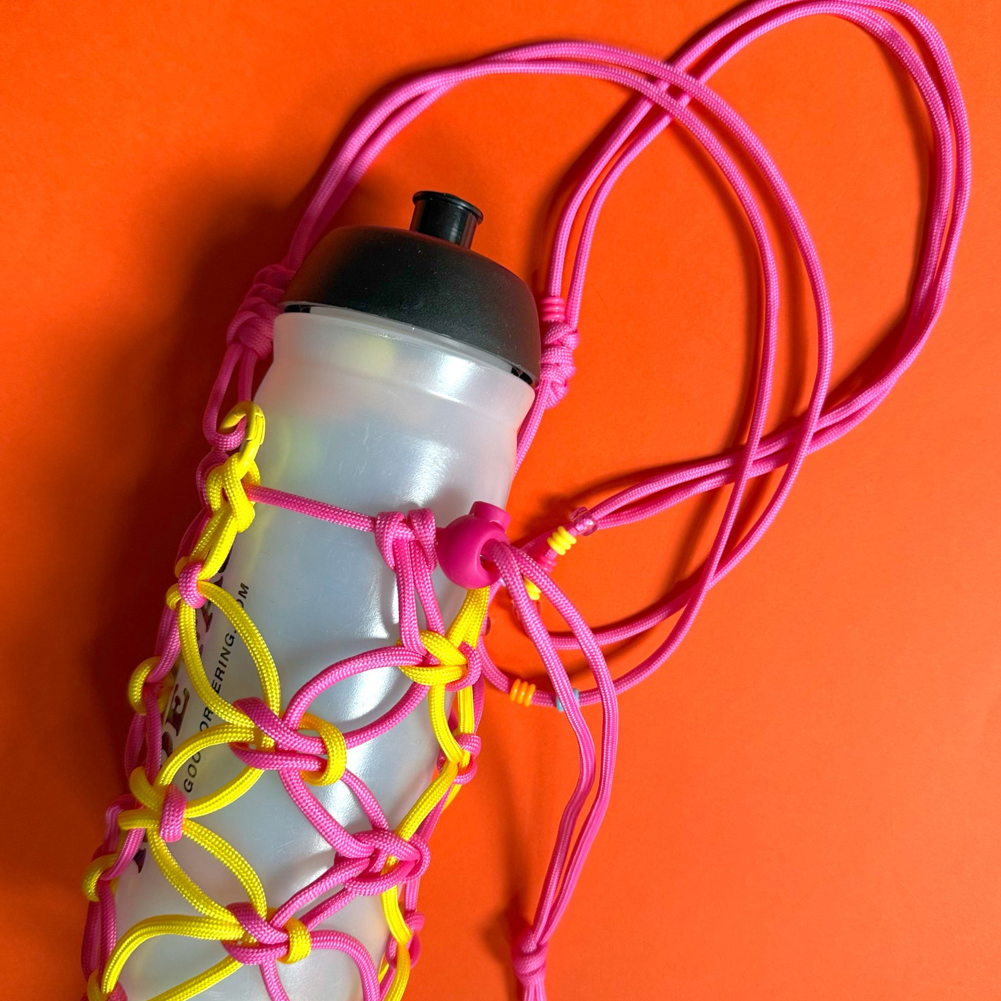 Paracord macrame bottle bag or net bag with tassel detail designed and made in Hackney by Goodordering Jacqui Ma. Neon ombre cord, adjustable in size can fit most water bottles.