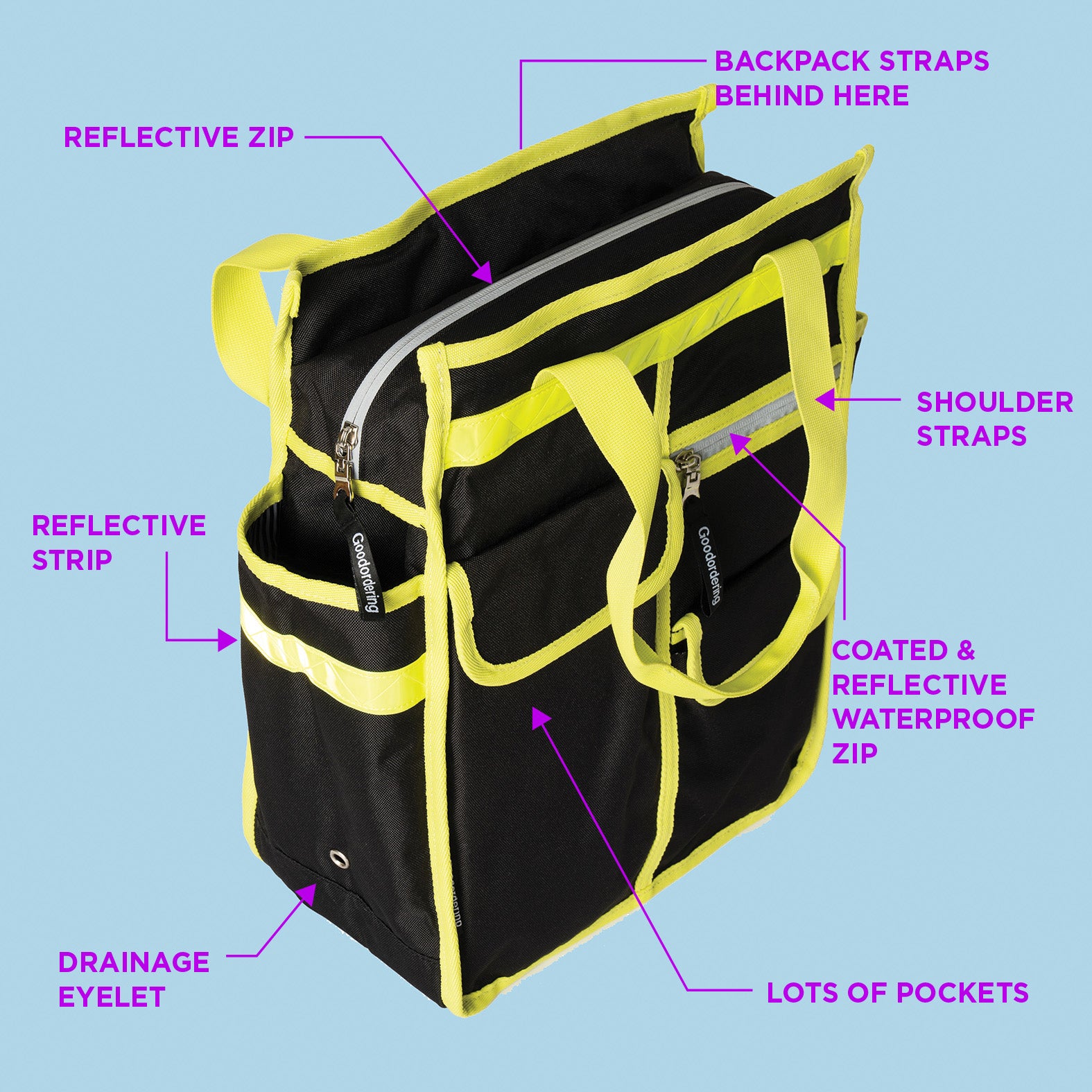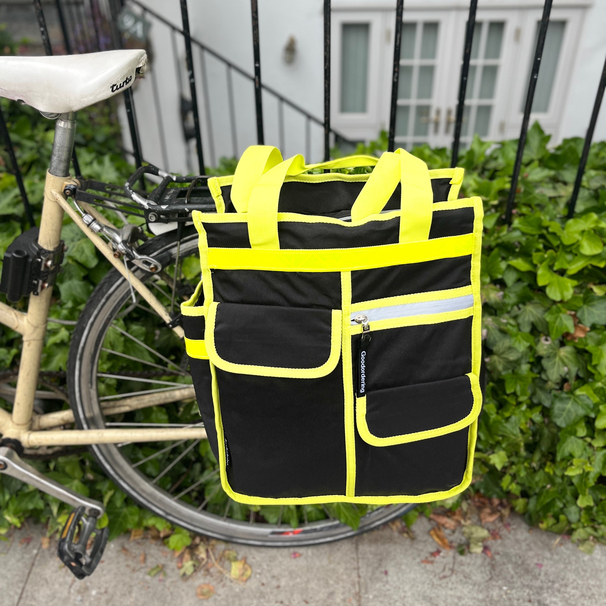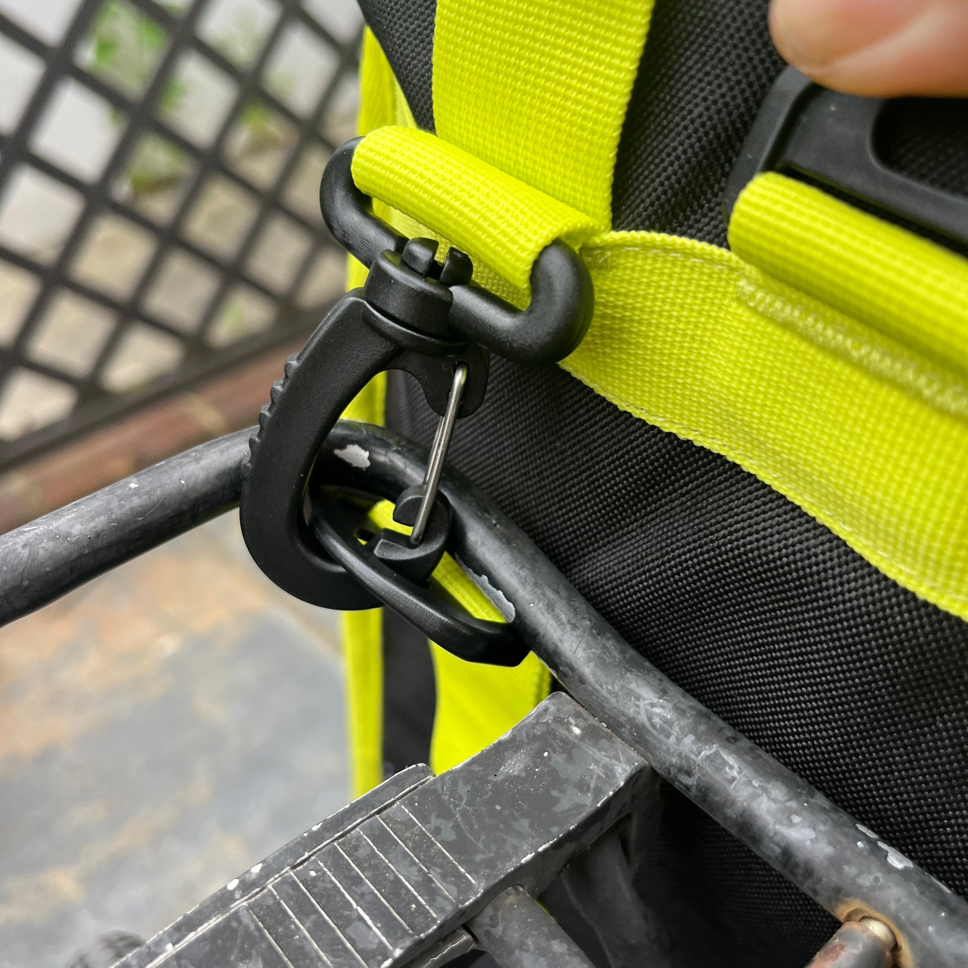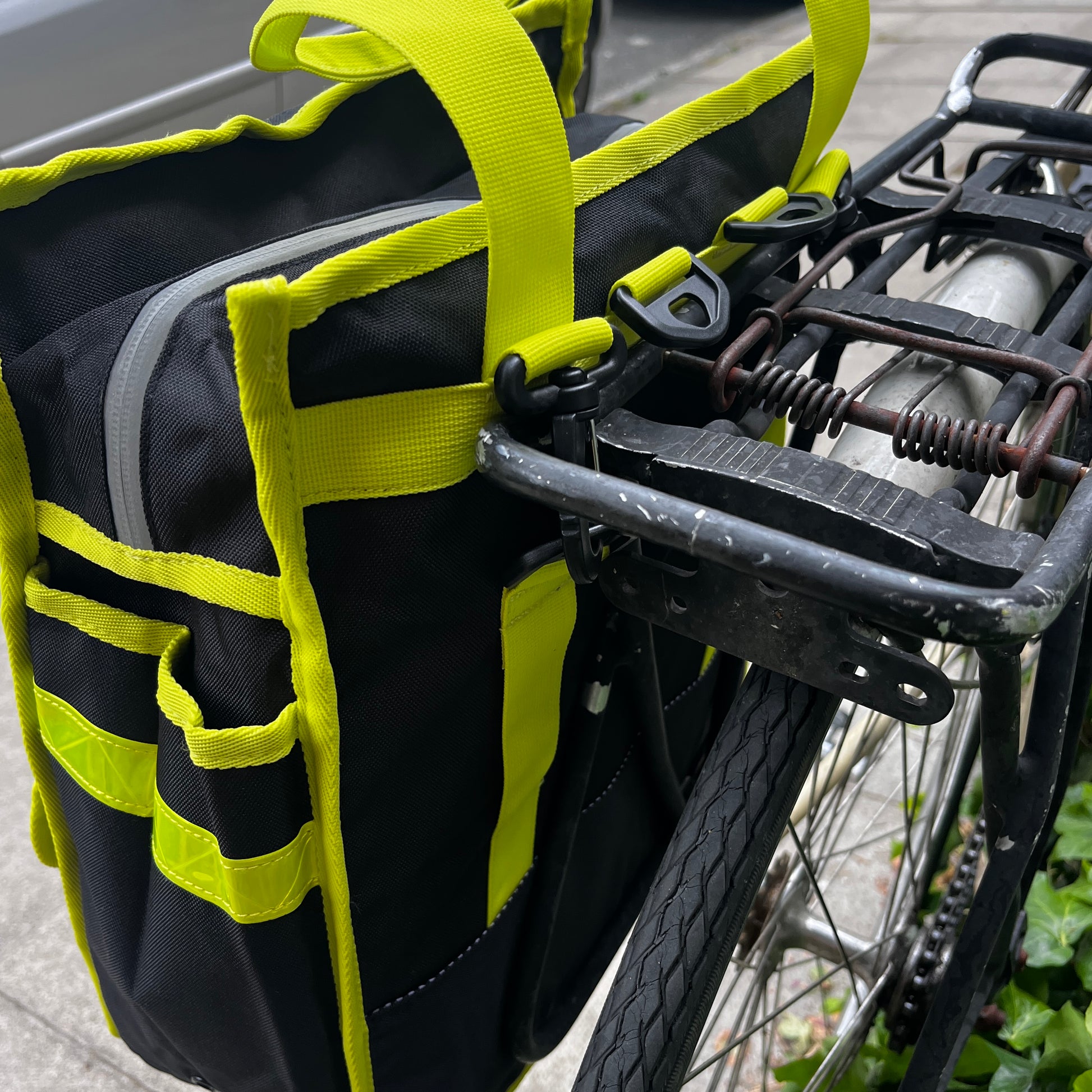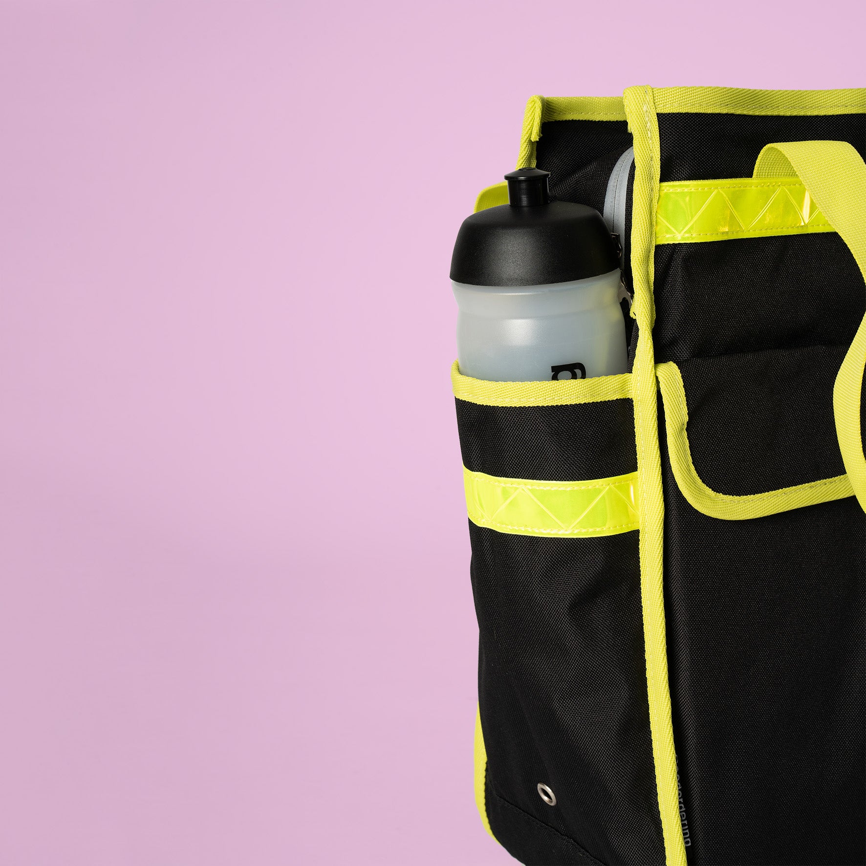 Bright yellow neon strong webbing straps that helps you to stand out at night when riding your bike. You can also machine wash this bag if it gets dirty.