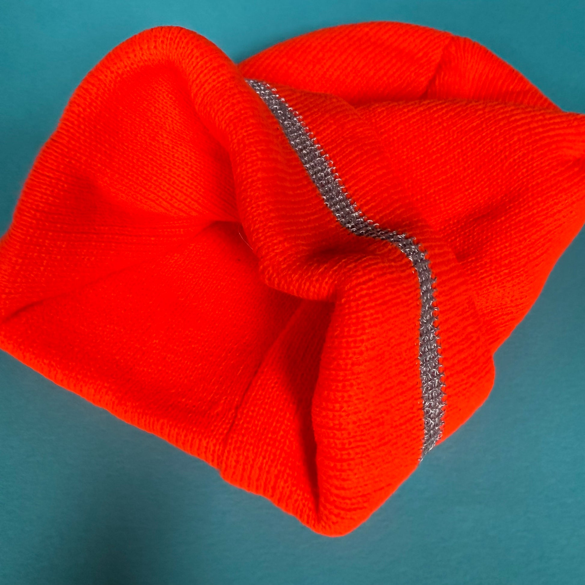 Orange knitted beanie with reflective yarn stripe. Perfect for keeping warm but also staying visible on your bicycle.