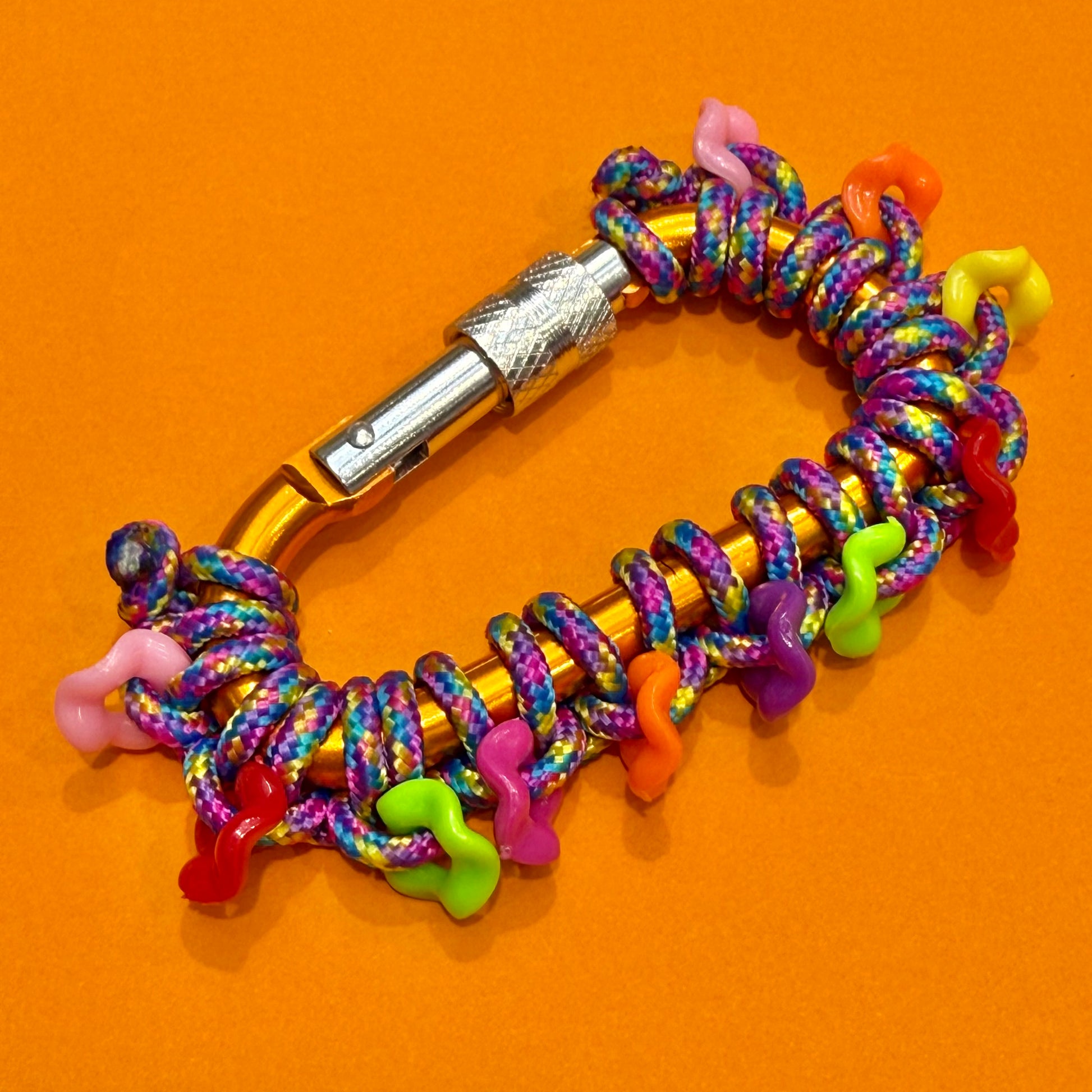 Lightweight aluminium carabiner wrapped with power cord and embellished with beads. Hand made in Hoxton, east london.