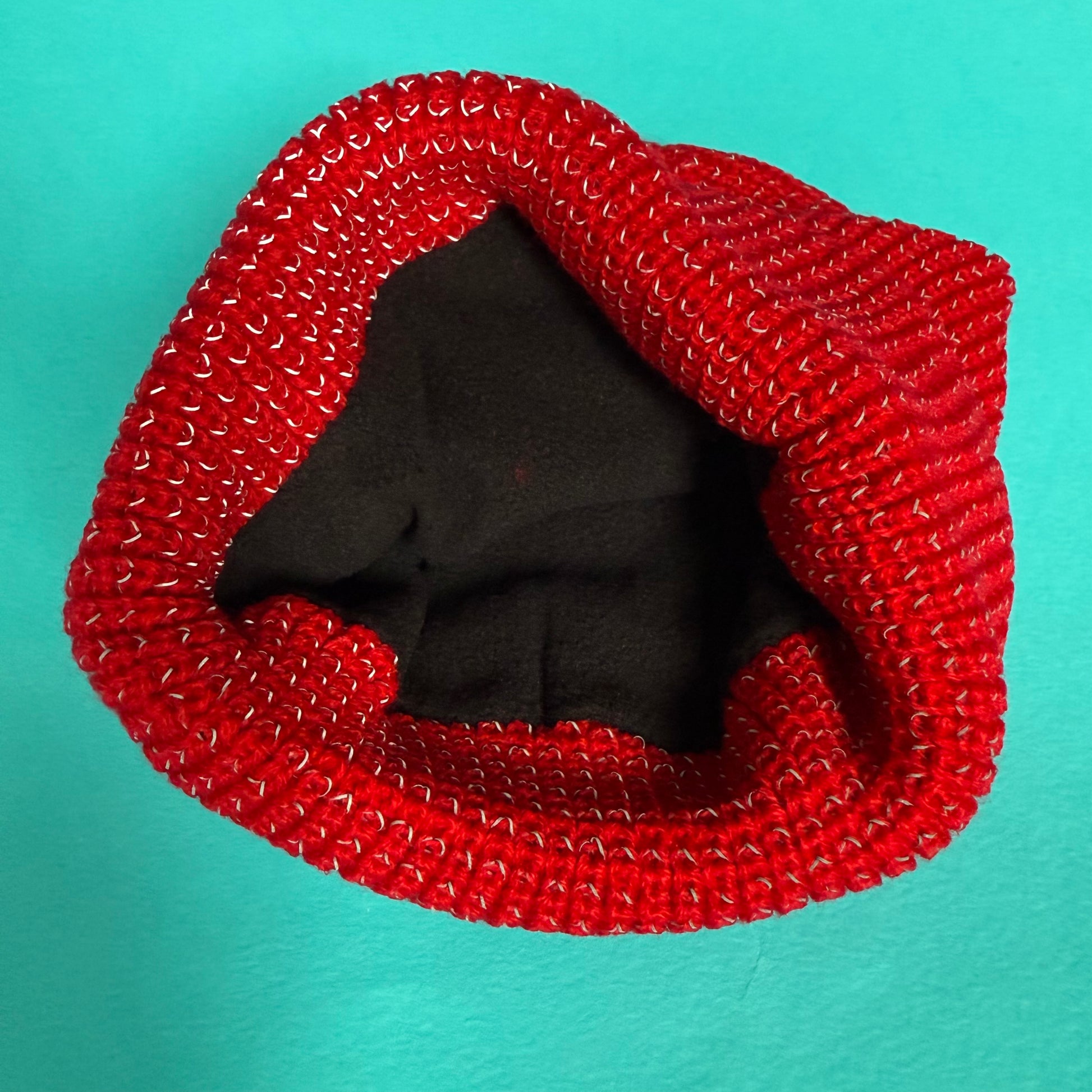 Red knitted beanie with reflective yarn speckles. Perfect for keeping warm but also staying visible on your bicycle.