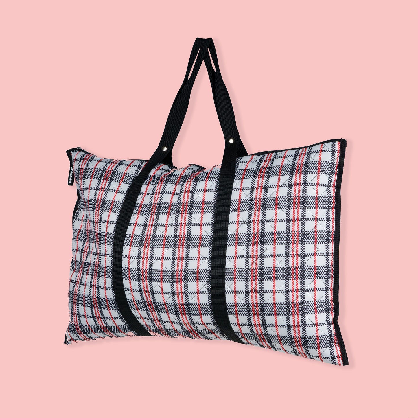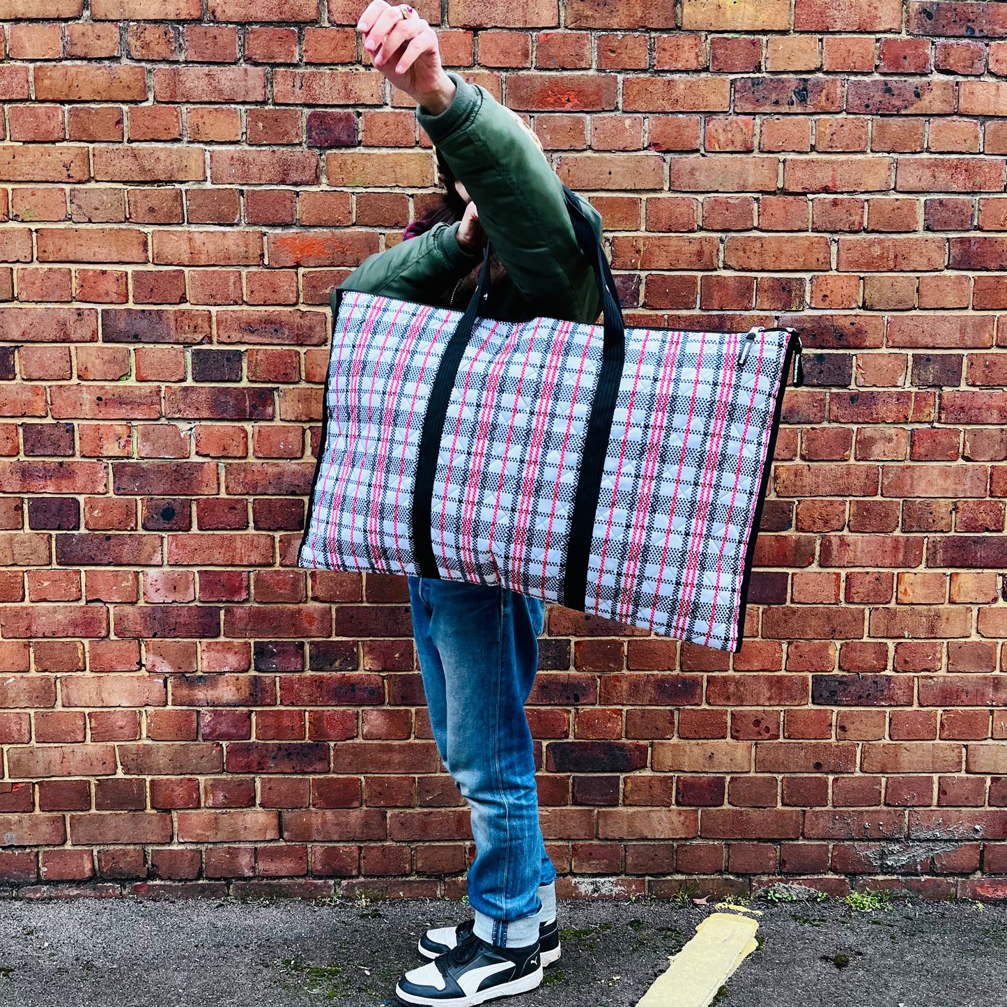 The tartan range was inspired by the iconic laundry bag fabric. Known to everyone all around the world in slightly different guises, a travel bag, a laundry, a moving bag. Widely available and extremely affordable, the laundry bag is bought from any 2 dollar shop / pound store or corner hardware home store around the world. The familiarity of the woven fabric invokes a nostalgic feeling. We have re-invented this fabric for higher durability, converting the woven fabric into a printed on a recycled nylon fabric. The result is sustainable and useful for everyday use, but will last a lot longer that the iconic bag that it is inspired by.