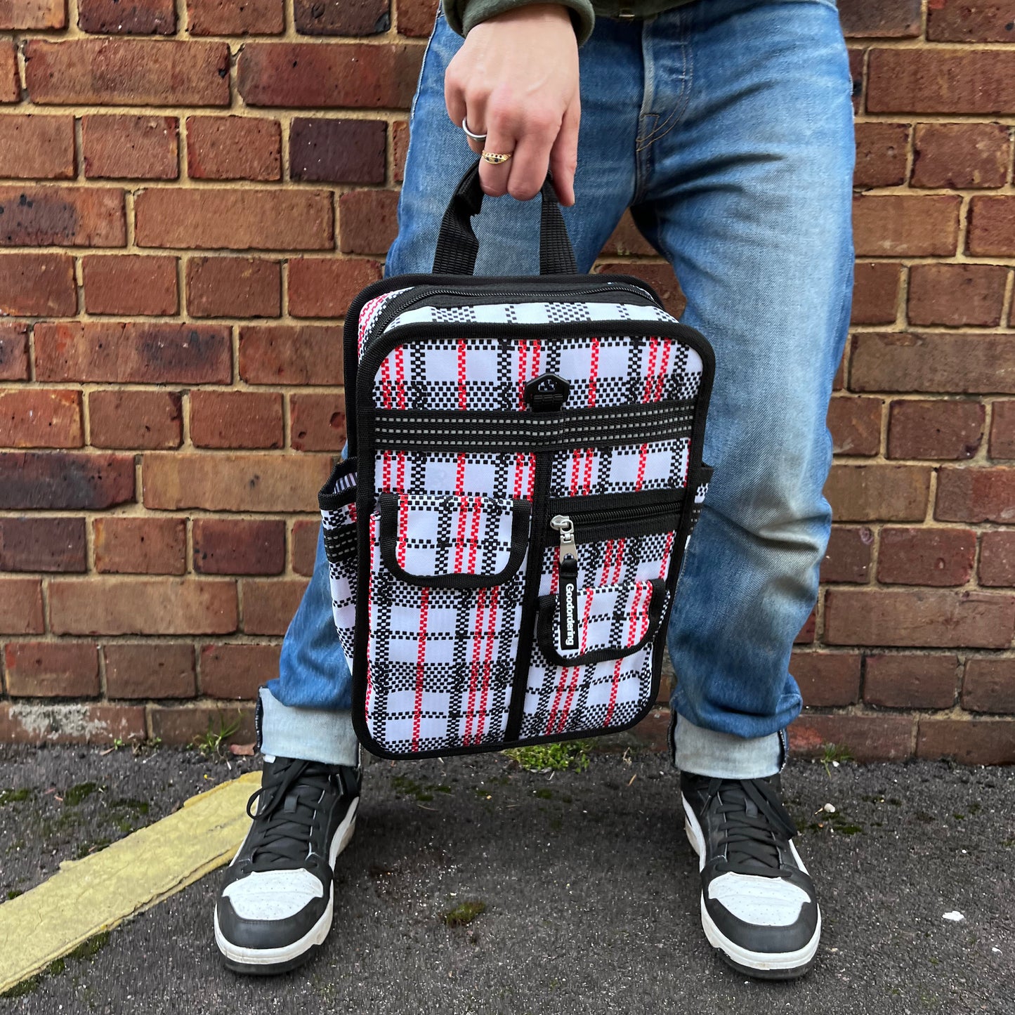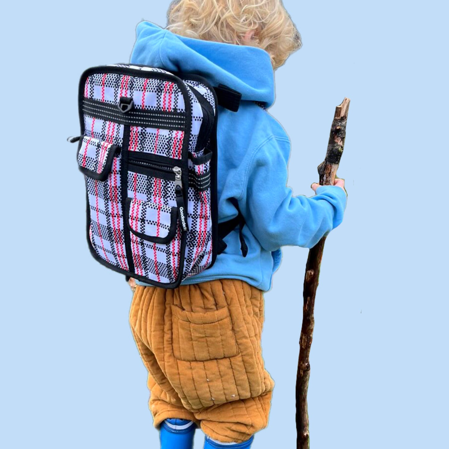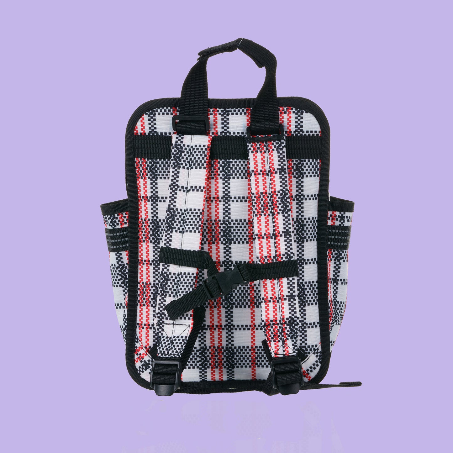 The tartan range was inspired by the iconic laundry bag fabric. Known to everyone all around the world in slightly different guises, a travel bag, a laundry, a moving bag. Widely available and extremely affordable, the laundry bag is bought from any 2 dollar shop / pound store or corner hardware home store around the world. The familiarity of the woven fabric invokes a nostalgic feeling. We have re-invented this fabric for higher durability, converting the woven fabric into a print on a recycled nylon fabric. The result is sustainable and useful for everyday use, but will last a lot longer that the iconic bag that it is inspired by.