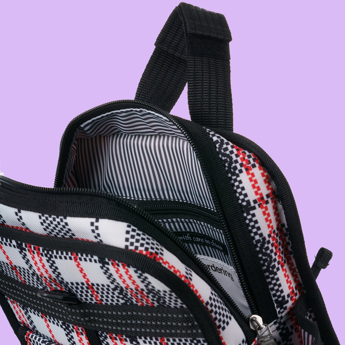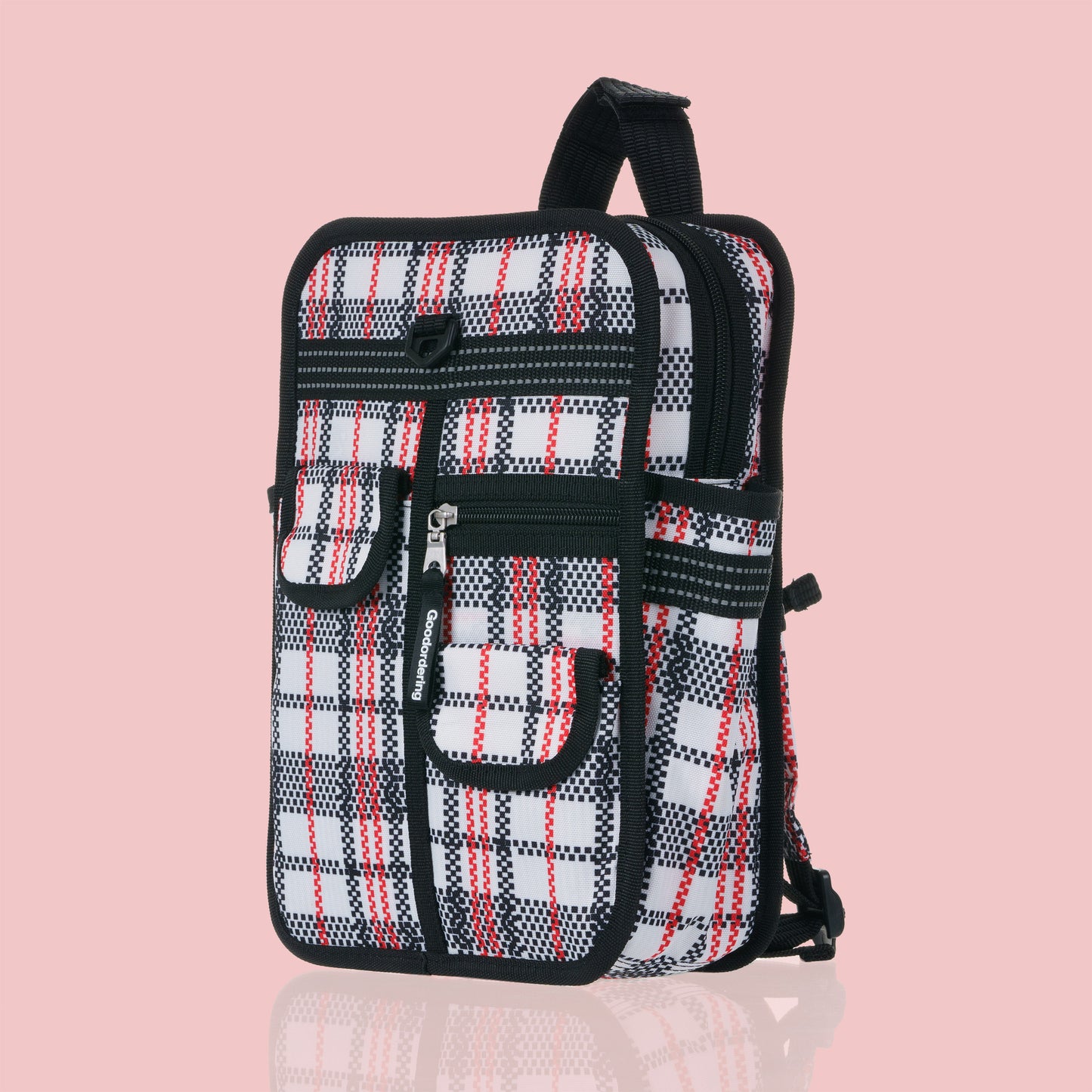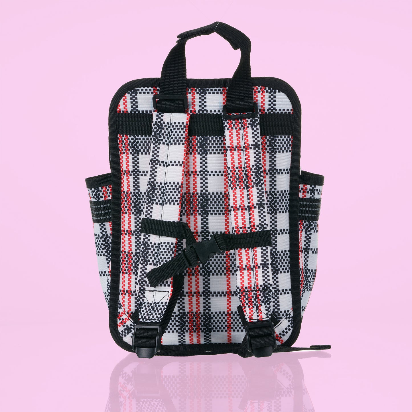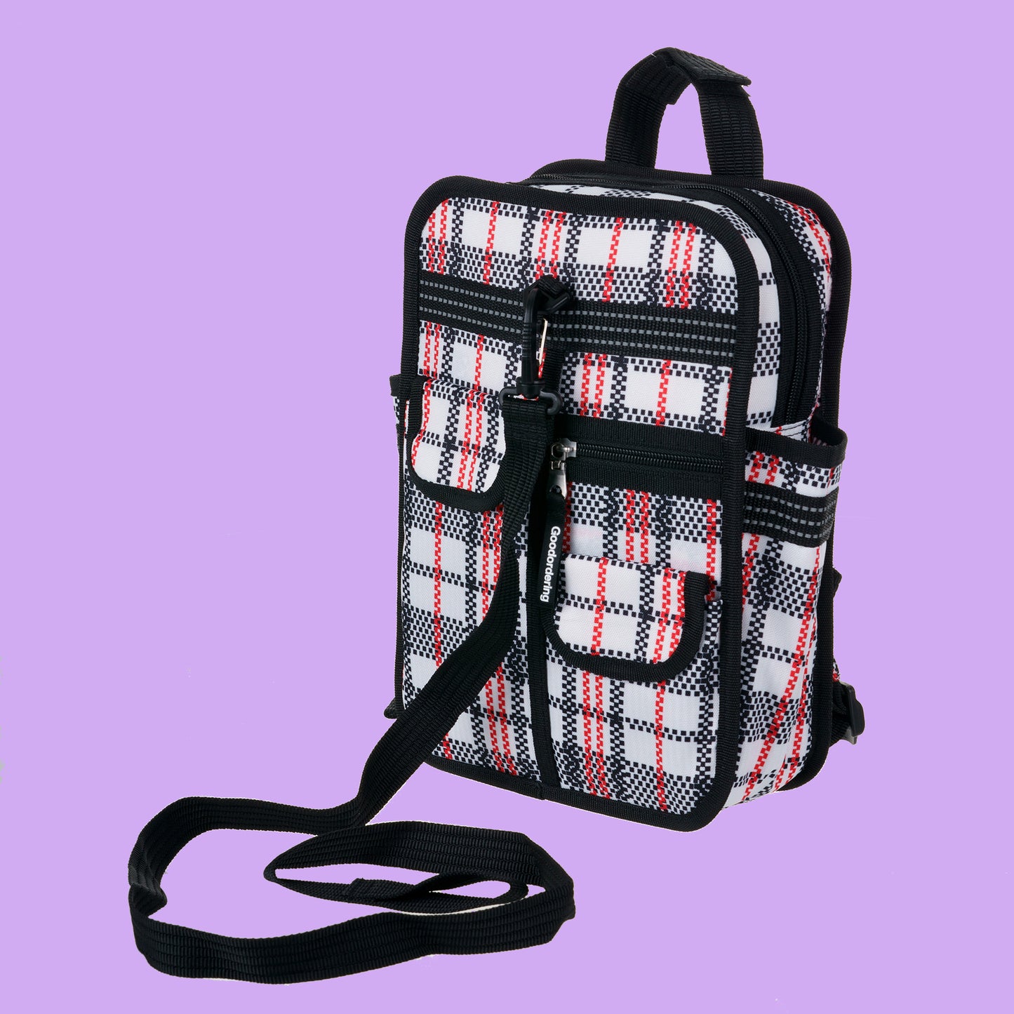 The tartan range was inspired by the iconic laundry bag fabric. Known to everyone all around the world in slightly different guises, a travel bag, a laundry, a moving bag. Widely available and extremely affordable, the laundry bag is bought from any 2 dollar shop / pound store or corner hardware home store around the world. The familiarity of the woven fabric invokes a nostalgic feeling. We have re-invented this fabric for higher durability, converting the woven fabric into a print on a recycled nylon fabric. The result is sustainable and useful for everyday use, but will last a lot longer that the iconic bag that it is inspired by.