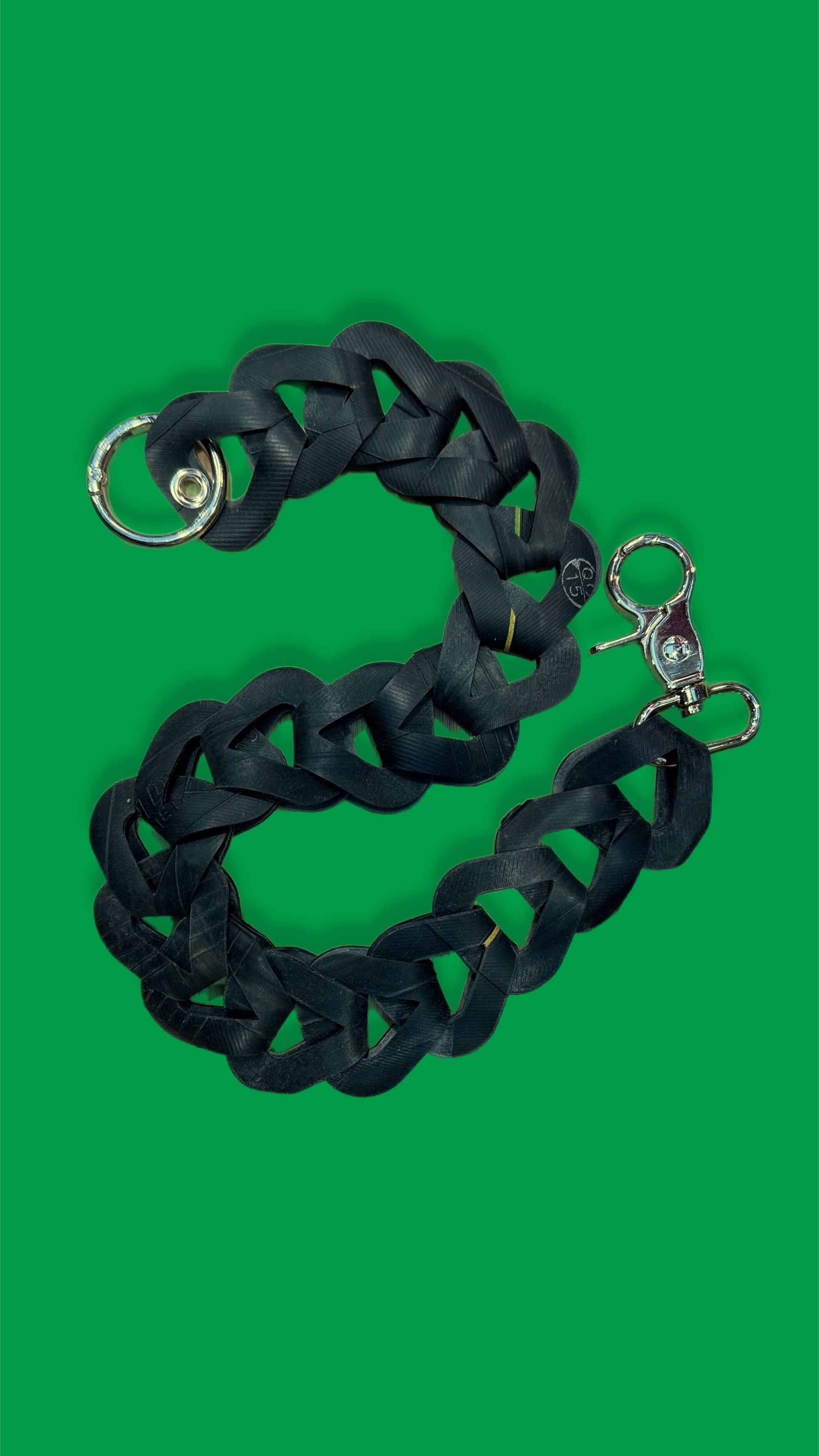Hand made locally from upcycled discarded bicycle inner tubes. Use it to connect your wallet to keys or as a strap for your phone.