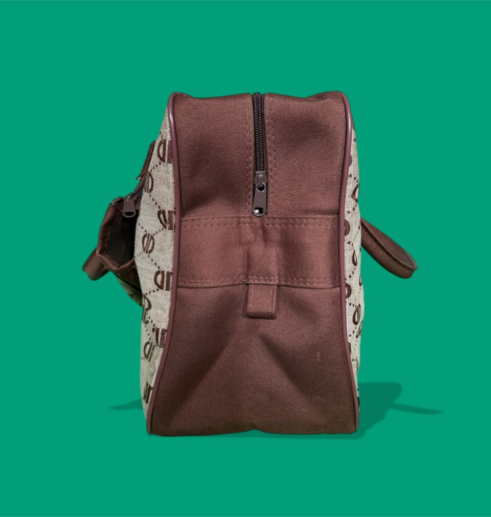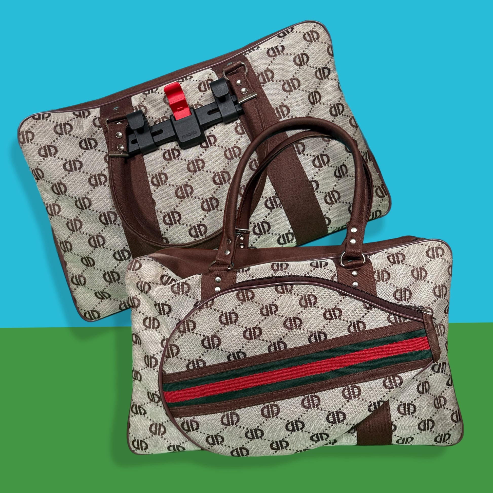 A specious bag with zip to main compartment & ventilation holes and front racquet pocket. Made from up-cycled vintage retro sports shoulder bag.